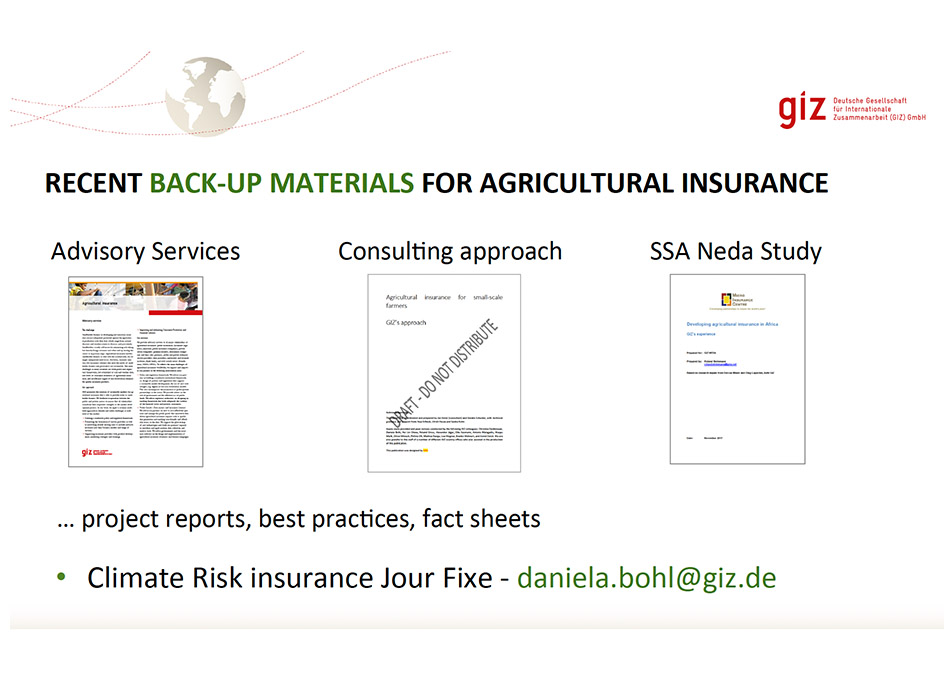 - Dearrollo de una propuesta para la vinculación de los servicios CRI (Climate Risk Insurance) como elemento transversal en las iniciativas rurales de GIZ para Asia y África.